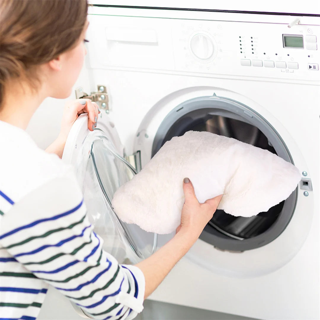 Bei stärkeren Verschmutzungen hilft meist nur die Waschmaschine. Dank des Reißverschlusses lässt sich der Kissenbezug bequem abziehen und bei 30° in der Maschine waschen.