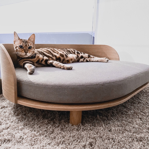 Die Basis bildet das charakteristische gebogene Buchenholz, das nicht nur für Stabilität sorgt, sondern dem Bett auch seine elegante Silhouette verleiht. Ein weiches Kissen und die hohe Rückenlehne schaffen eine behagliche Rückzugsoase, in der Hunde und Katzen gleichermaßen entspannen können.