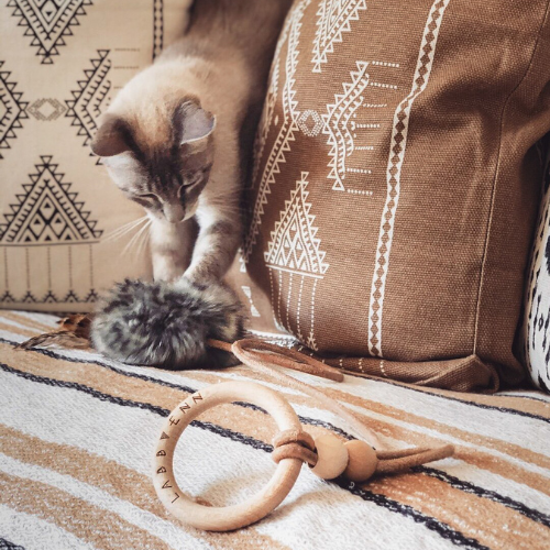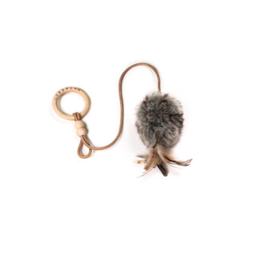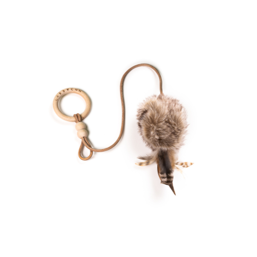 Handgefertigt mit viel Liebe zum Detail, kombiniert MUSSE einen Lederriemen mit Holzelementen, echten Federn und hochwertigem Kunstfell – perfekt, um den Jagdinstinkt deiner Samtpfote spielerisch zu fördern.