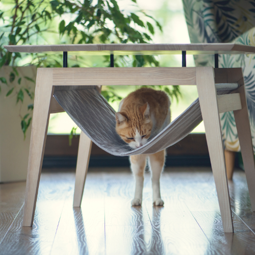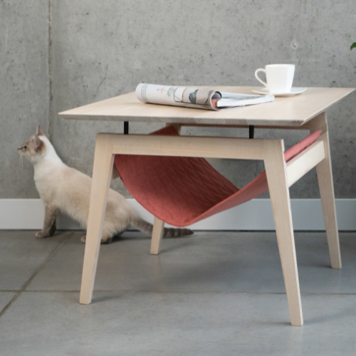 Der Labbvenn Tisch KIKKO vereint minimalistisches skandinavisches Design mit cleverer Funktionalität. Auf den ersten Blick ein stilvoller Couchtisch, offenbart er auf den zweiten Blick seine Besonderheit: ein integriertes, gepolstertes Katzen-Hängemattenelement, das deinem Stubentiger einen gemütlichen Platz zum Entspannen bietet – mitten im Wohnraum und ganz nah bei dir.