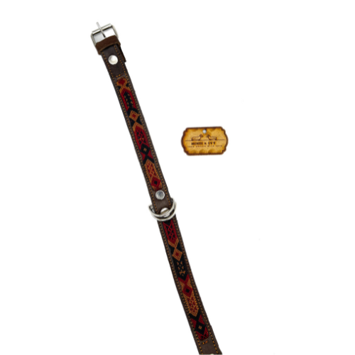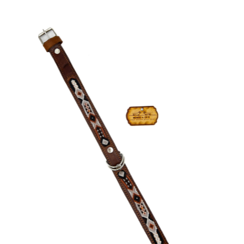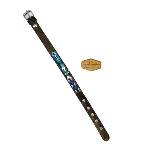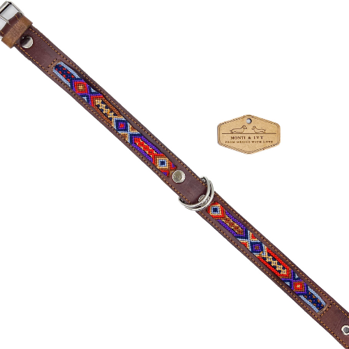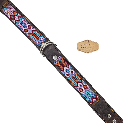 Das Monti and Ivy Halsband OASIS vereint zeitlose Eleganz mit farbenfrohem, handgefertigtem Design. Die Basis besteht aus hochwertigem, robustem mexikanischem Leder, das nicht nur langlebig, sondern auch angenehm zu tragen ist. In das Leder eingearbeitet ist ein kunstvolles, buntes Webmuster – jedes Stück ein Unikat mit einzigartigen Farbkombinationen.
