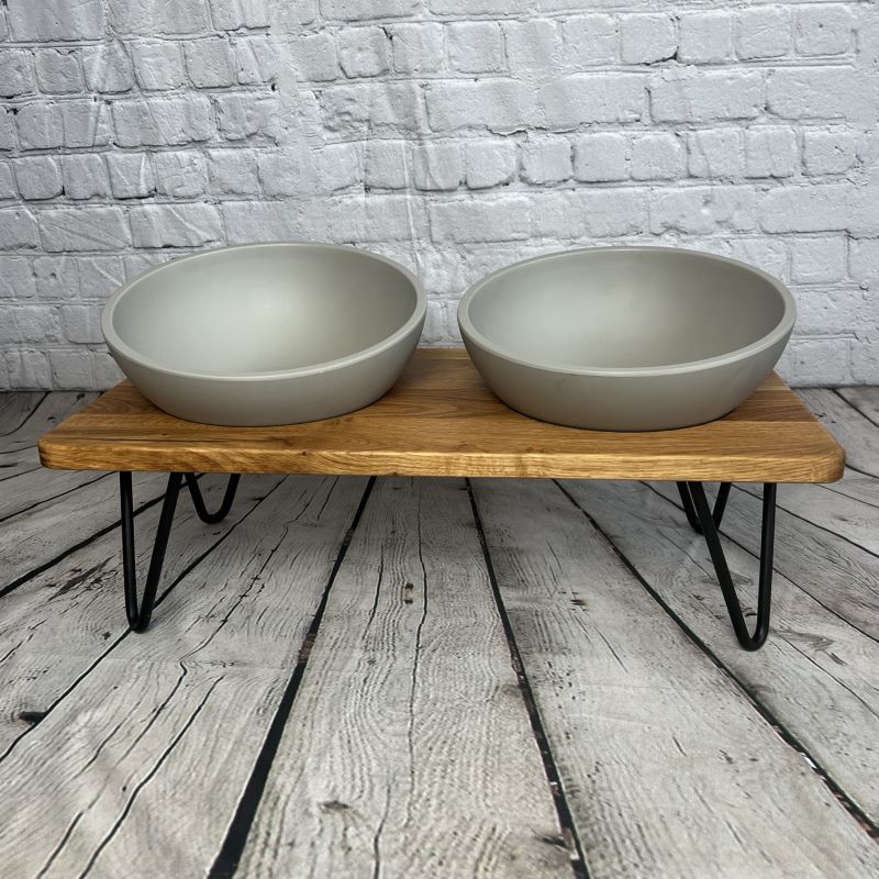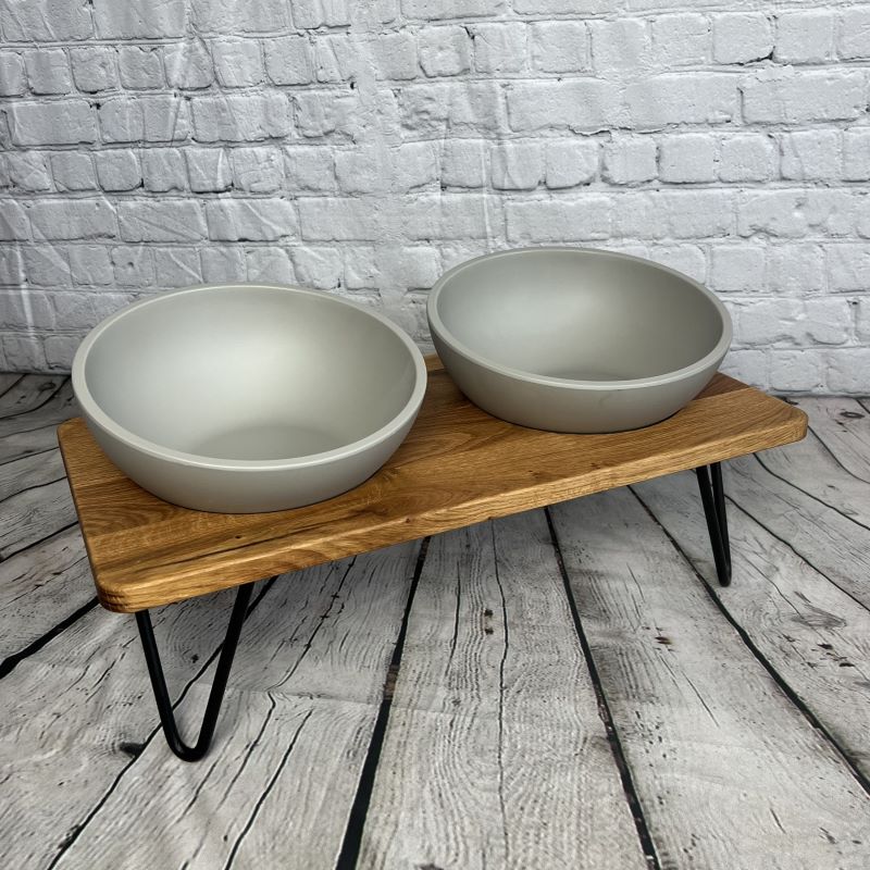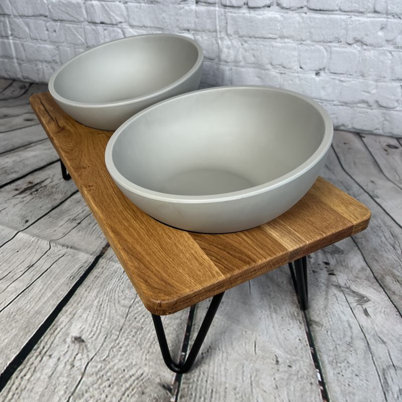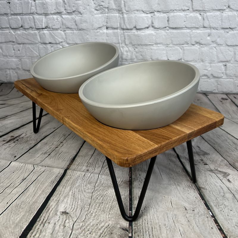 Diese exklusive Futterstation vereint minimalistisches Design mit höchster Funktionalität und wird in liebevoller Handarbeit für dich gefertigt. Die Kombination aus massiver Eichenholzplatte, modernen Haarnadel-Fußgestellen und hochwertigen Näpfen in Betonoptik macht sie zu einem stilvollen Blickfang in jedem Zuhause.