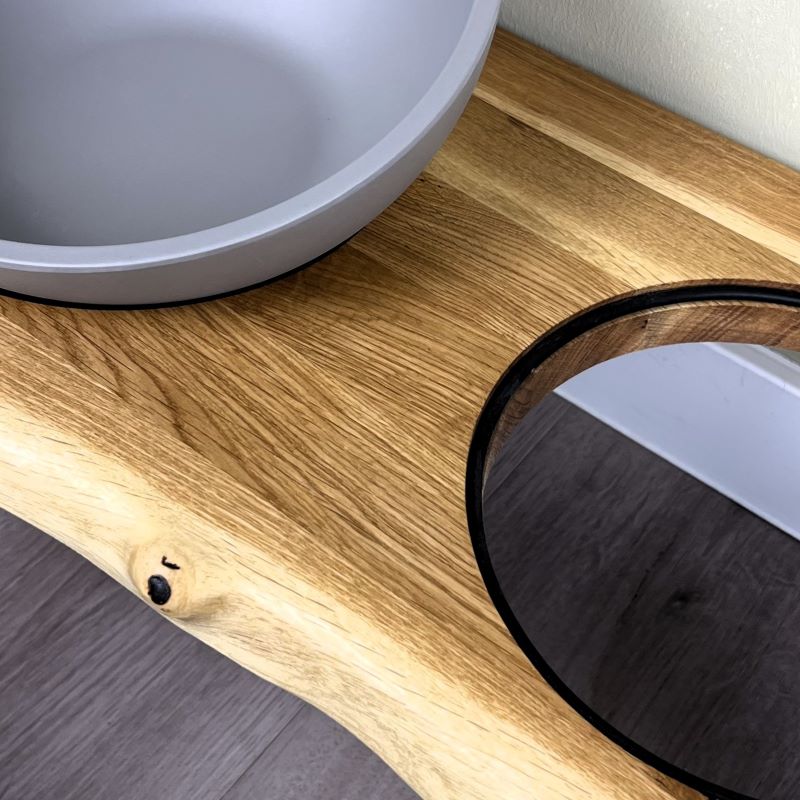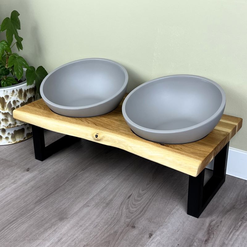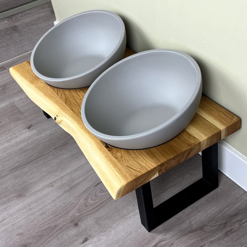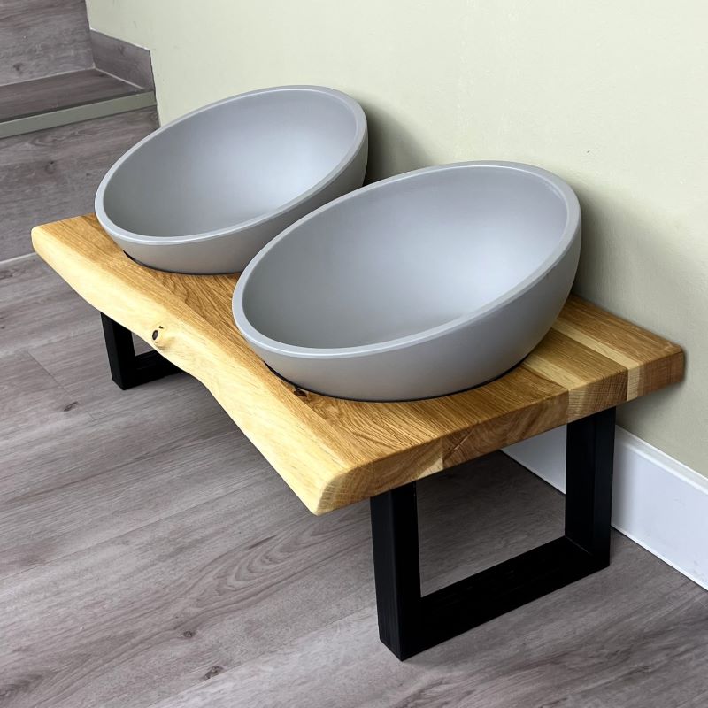 Diese exklusive Futterstation vereint hochwertiges Naturdesign mit maximalem Komfort für deinen Vierbeiner. Aus massiver, FSC-zertifizierter Eiche gefertigt und mit einer charaktervollen Baumkante versehen, wird jede Station zum Einzelstück. Die Verbindung von minimalistischen Füßen, passgenau eingelassenen Näpfen in Betonoptik und einer stilvollen Holzbohle bringt Wärme und Eleganz in dein Zuhause.