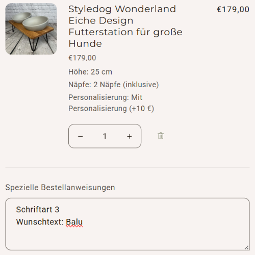 - Schriftart & Text angeben: Schriftart und Wunschtext im Warenkorb unter "Spezielle Bestellanweisungen" eintragen.